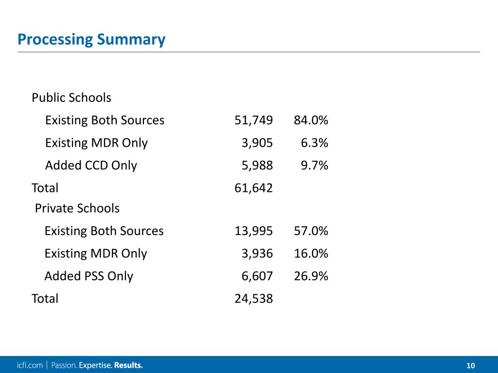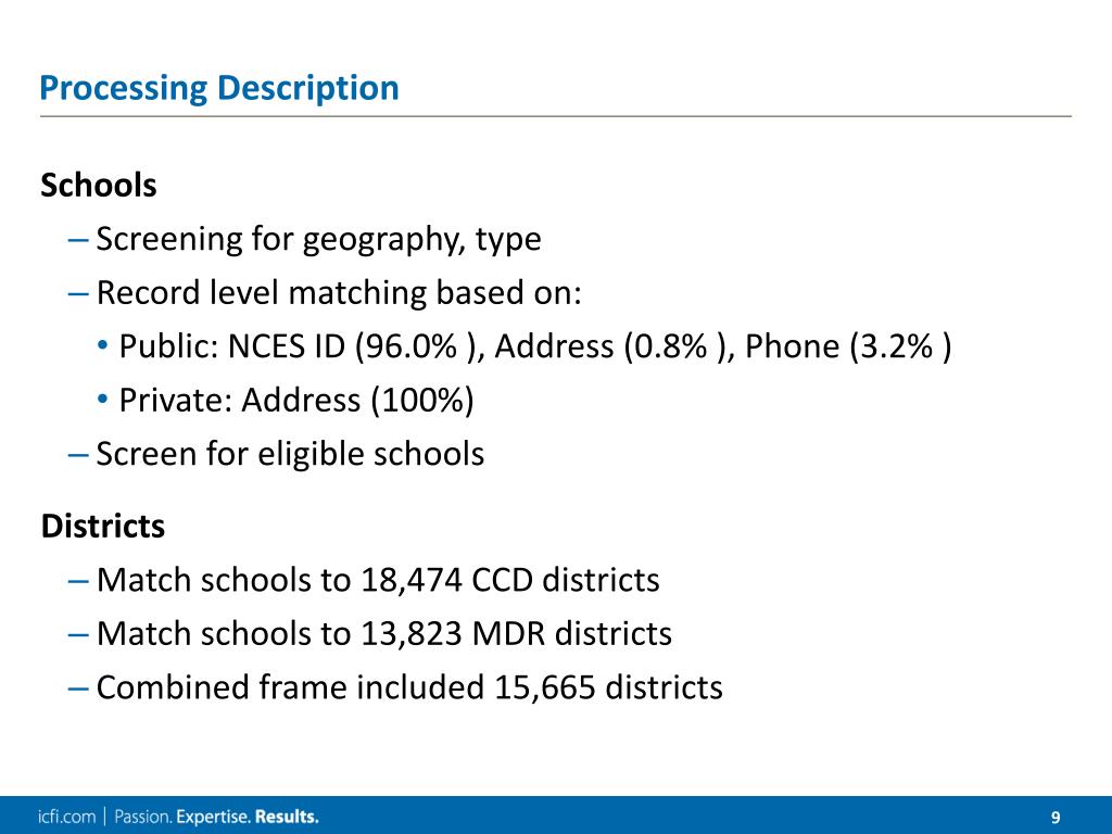 Processing Description Schools • Screening for geography, type • Record level matching based on: • Public: NCES ID (96.0% ), Address (0.8% ), Phone (3.2% ) • Private: Address (100%) • Screen for eligible schools Districts • Match schools to 18,474 CCD districts • Match schools to 13,823 MDR districts • Combined frame included 15,665 districts