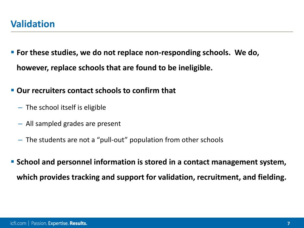 For these studies, we do not replace non-responding schools. We do, however, replace schools that are found to be ineligible. Our recruiters contact schools to confirm that • The school itself is eligible • All sampled grades are present • The students are not a “pull-out” population from other schools School and personnel information is stored in a contact management system, which provides tracking and support for validation, recruitment, and fielding. Validation