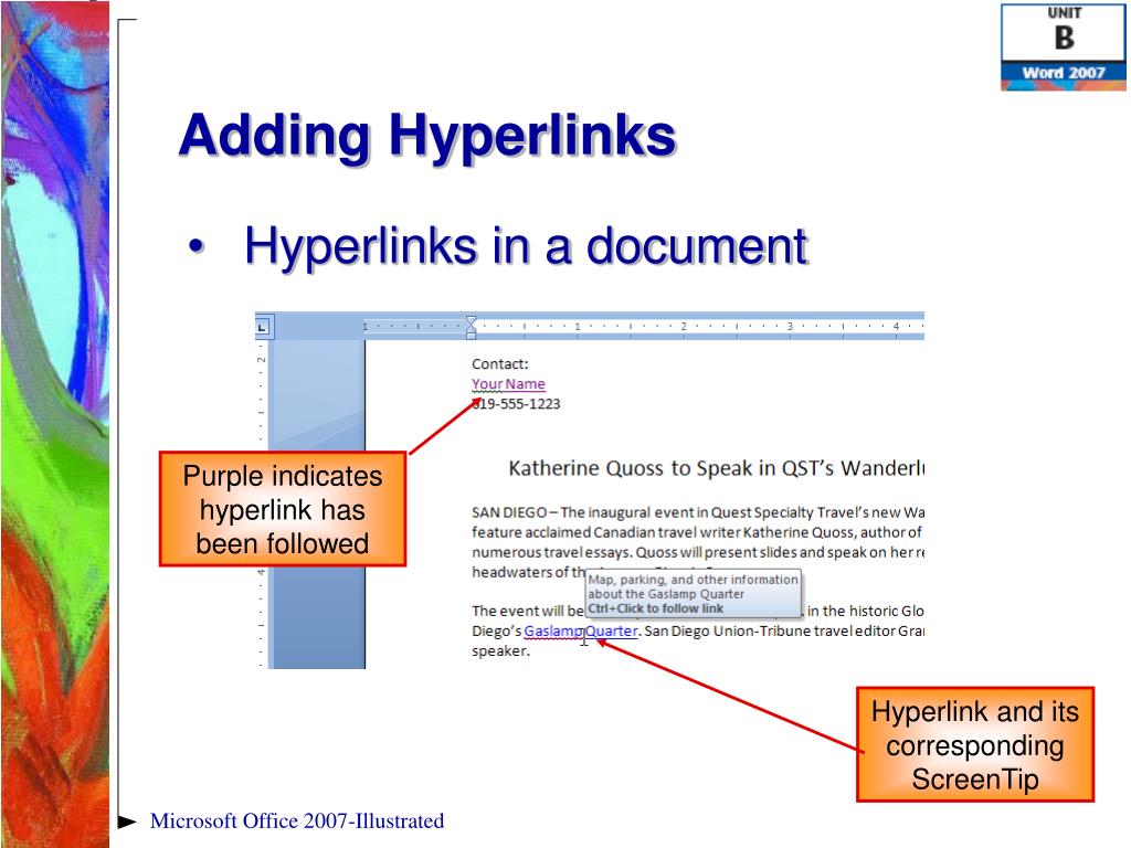 Adding Hyperlinks • Hyperlinks in a document Purple indicates hyperlink has been followed Hyperlink and its corresponding ScreenTip Microsoft Office 2007-Illustrated