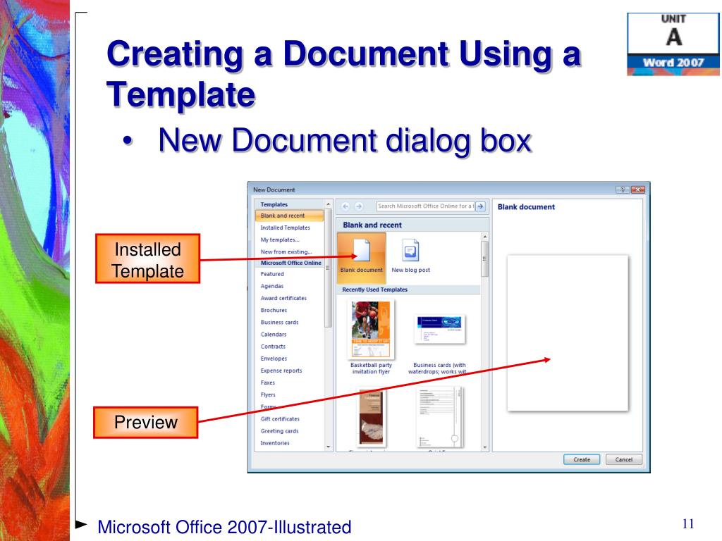 Creating a Document Using a Template • New Document dialog box Installed Template Preview Microsoft Office 2007-Illustrated