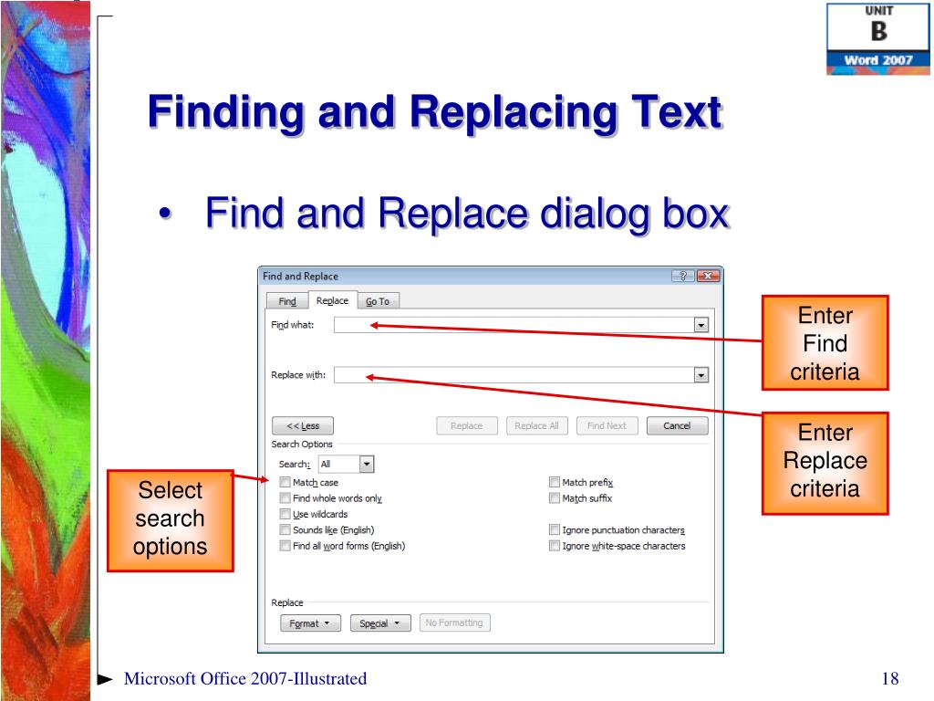Finding and Replacing Text • Find and Replace dialog box Enter Find criteria Enter Replace criteria Select search options Microsoft Office 2007-Illustrated