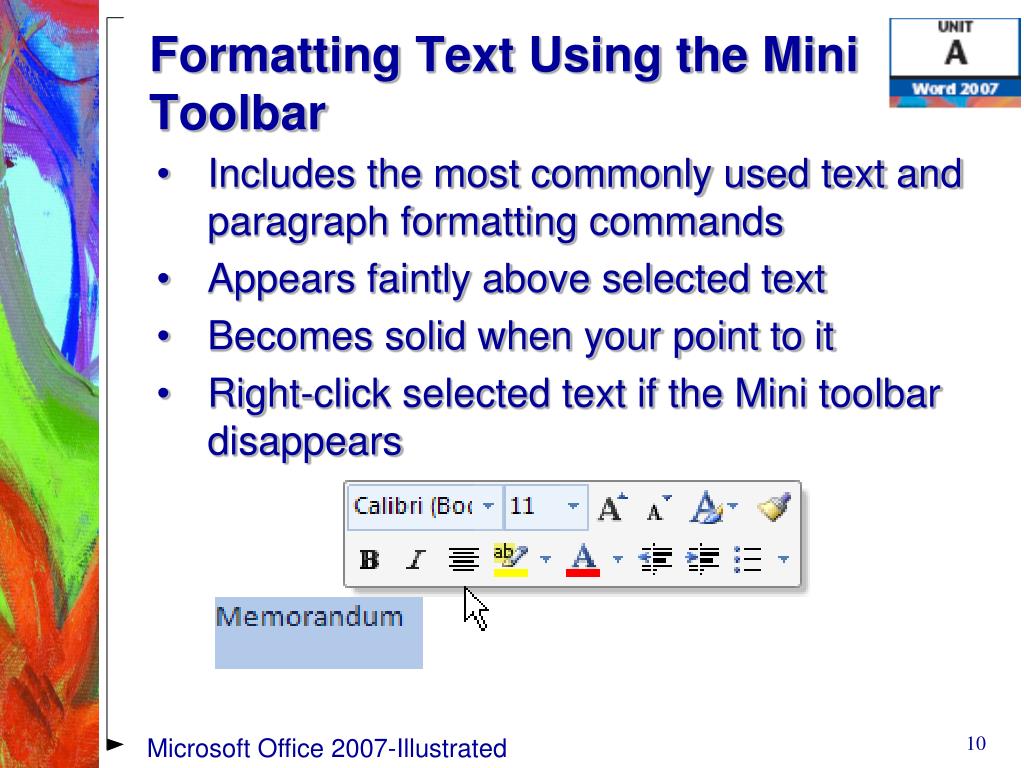 Formatting Text Using the Mini Toolbar • Includes the most commonly used text and paragraph formatting commands • Appears faintly above selected text • Becomes solid when your point to it • Right-click selected text if the Mini toolbar disappears Microsoft Office 2007-Illustrated