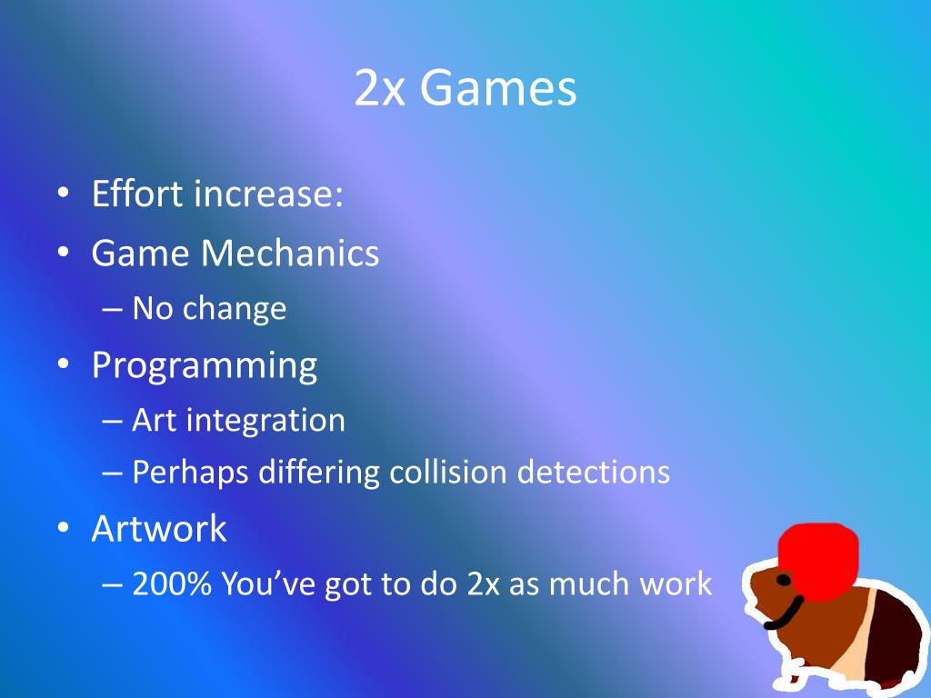 2x Games • Effort increase: • Game Mechanics • No change • Programming • Art integration • Perhaps differing collision detections • Artwork • 200% You’ve got to do 2x as much work
