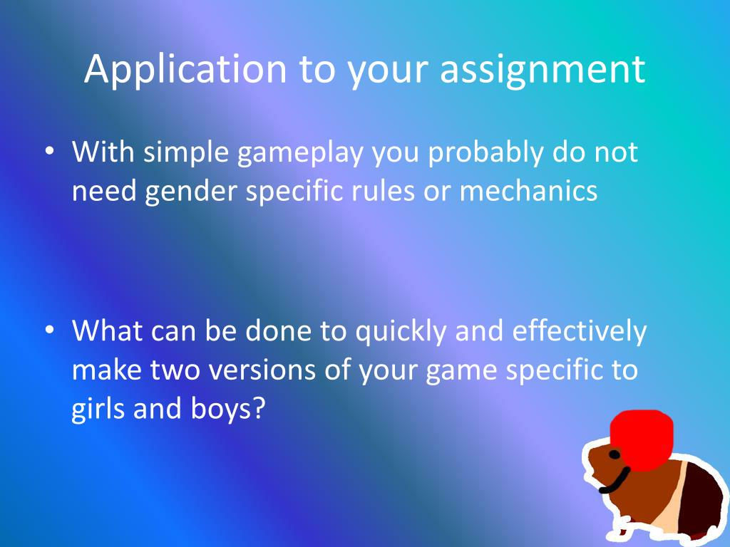 Application to your assignment • With simple gameplay you probably do not need gender specific rules or mechanics • What can be done to quickly and effectively make two versions of your game specific to girls and boys?