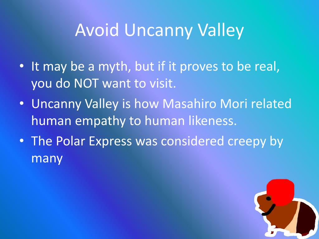Avoid Uncanny Valley • It may be a myth, but if it proves to be real, you do NOT want to visit. • Uncanny Valley is how Masahiro Mori related human empathy to human likeness. • The Polar Express was considered creepy by many