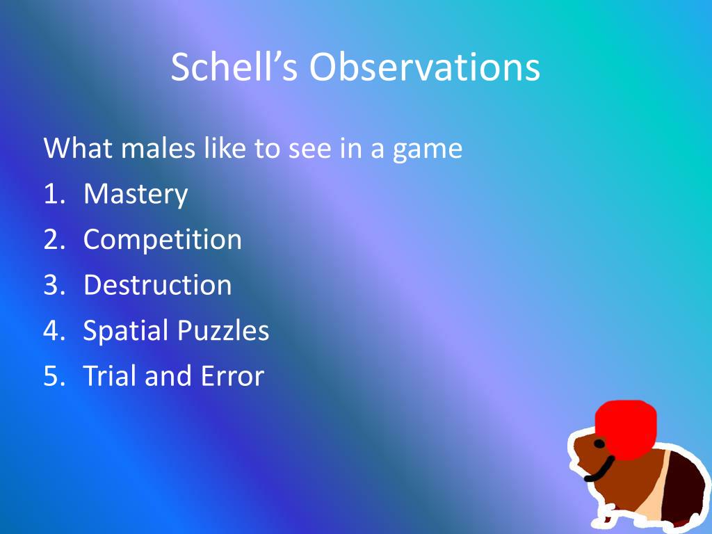 Schell’s Observations What males like to see in a game • Mastery • Competition • Destruction • Spatial Puzzles • Trial and Error
