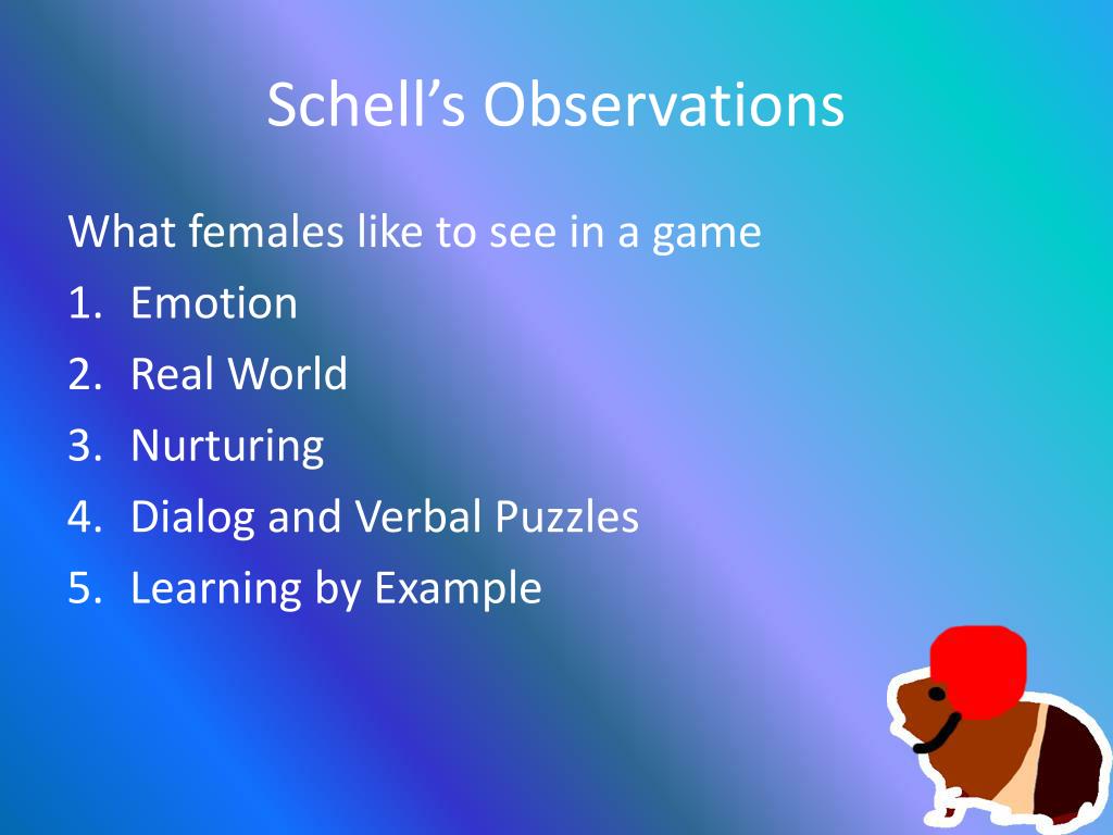 Schell’s Observations What females like to see in a game • Emotion • Real World • Nurturing • Dialog and Verbal Puzzles • Learning by Example