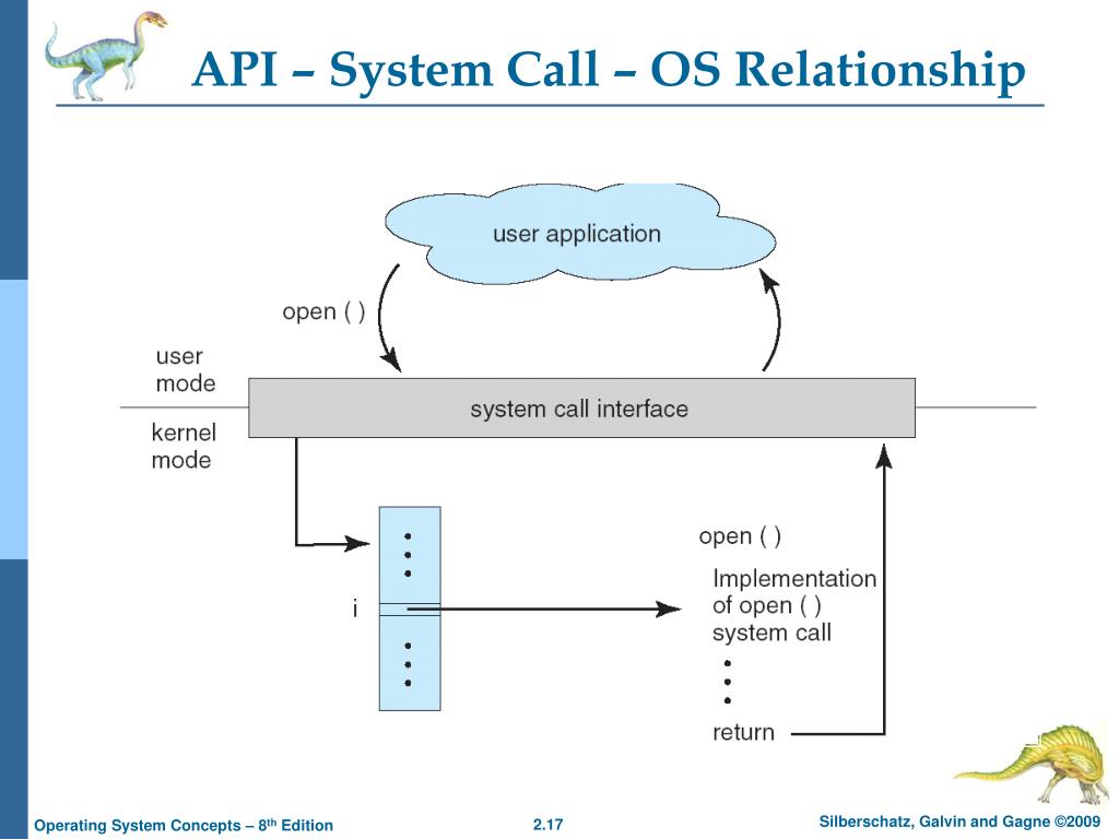 Example of Standard API • Consider the ReadFile() function in the Win32 API—a function for reading from a file • A description of the parameters passed to ReadFile() • HANDLE file—the file to be read • LPVOID buffer—a buffer where the data will be read into and written from • DWORD bytesToRead—the number of bytes to be read into the buffer • LPDWORD bytesRead—the number of bytes read during the last read • LPOVERLAPPED ovl—indicates if overlapped I/O is being used