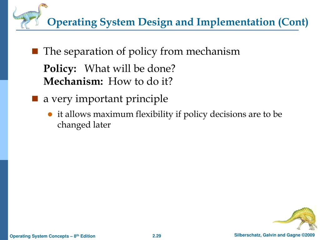 Operating System Design and Implementation (Cont) • The separation of policy from mechanism Policy: What will be done?Mechanism: How to do it? • a very important principle • it allows maximum flexibility if policy decisions are to be changed later