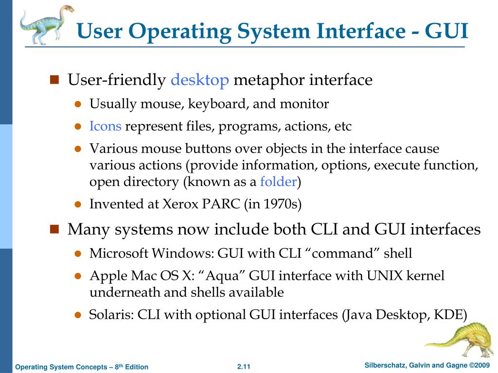 User Operating System Interface - GUI • User-friendly desktop metaphor interface • Usually mouse, keyboard, and monitor • Icons represent files, programs, actions, etc • Various mouse buttons over objects in the interface cause various actions (provide information, options, execute function, open directory (known as a folder) • Invented at Xerox PARC (in 1970s) • Many systems now include both CLI and GUI interfaces • Microsoft Windows: GUI with CLI “command” shell • Apple Mac OS X: “Aqua” GUI interface with UNIX kernel underneath and shells available • Solaris: CLI with optional GUI interfaces (Java Desktop, KDE)