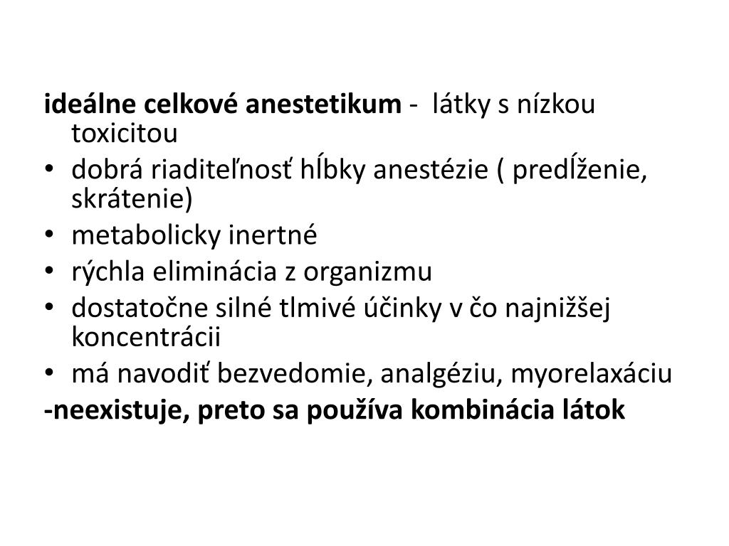 ideálne celkové anestetikum - látky s nízkou toxicitou • dobrá riaditeľnosť hĺbky anestézie ( predĺženie, skrátenie) • metabolicky inertné • rýchla eliminácia z organizmu • dostatočne silné tlmivé účinky v čo najnižšej koncentrácii • má navodiť bezvedomie, analgéziu, myorelaxáciu -neexistuje, preto sa používa kombinácia látok