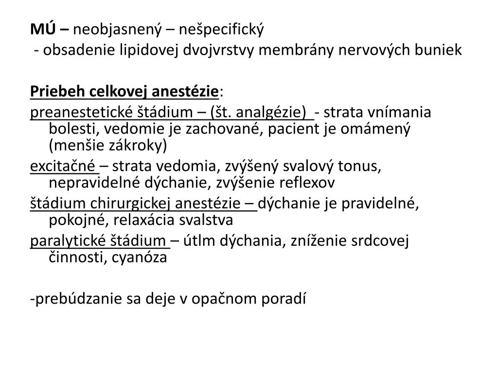 MÚ – neobjasnený – nešpecifický - obsadenie lipidovejdvojvrstvy membrány nervových buniek Priebeh celkovej anestézie: preanestetické štádium – (št. analgézie) - strata vnímania bolesti, vedomie je zachované, pacient je omámený (menšie zákroky) excitačné– strata vedomia, zvýšený svalový tonus, nepravidelné dýchanie, zvýšenie reflexov štádium chirurgickej anestézie – dýchanie je pravidelné, pokojné, relaxácia svalstva paralytické štádium – útlm dýchania, zníženie srdcovej činnosti, cyanóza -prebúdzanie sa deje v opačnom poradí