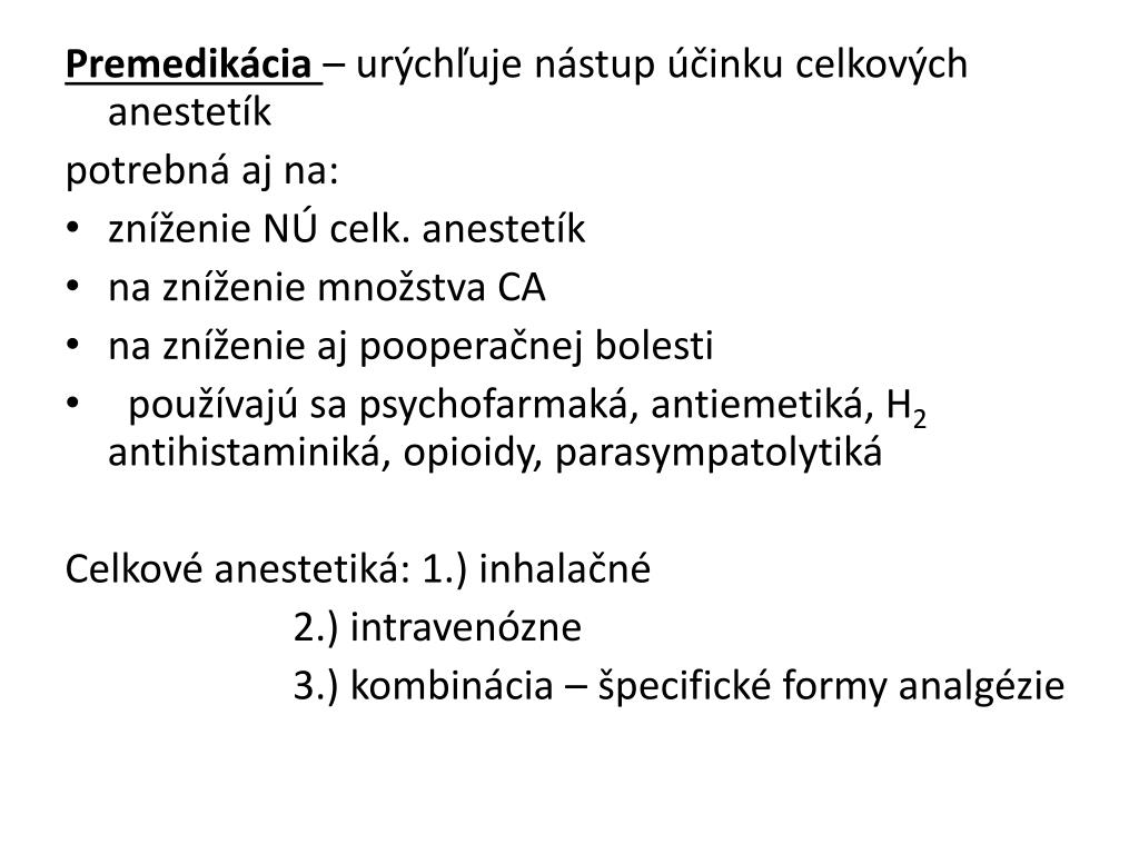 Premedikácia– urýchľuje nástup účinku celkových anestetík potrebná aj na: • zníženie NÚ celk. anestetík • na zníženie množstva CA • na zníženie aj pooperačnej bolesti • používajú sa psychofarmaká, antiemetiká, H2antihistaminiká, opioidy, parasympatolytiká Celkové anestetiká: 1.) inhalačné 2.) intravenózne 3.) kombinácia – špecifické formy analgézie