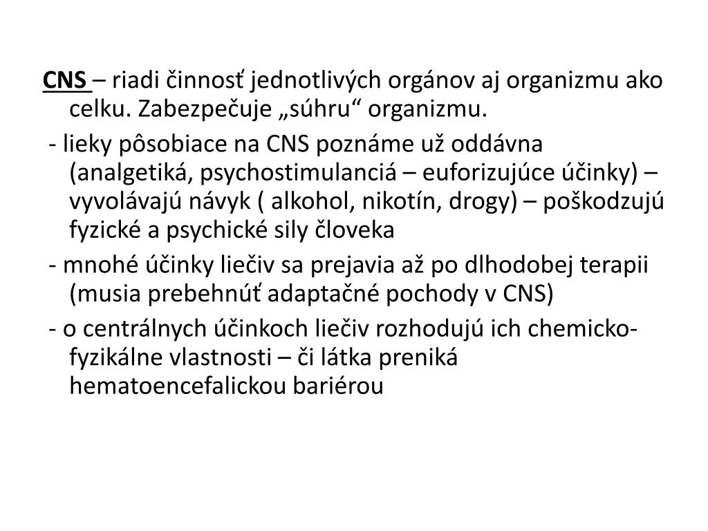 CNS – riadi činnosť jednotlivých orgánov aj organizmu ako celku. Zabezpečuje „súhru“ organizmu. - lieky pôsobiace na CNS poznáme už oddávna (analgetiká, psychostimulanciá – euforizujúce účinky) – vyvolávajú návyk ( alkohol, nikotín, drogy) – poškodzujú fyzické a psychické sily človeka - mnohé účinky liečiv sa prejavia až po dlhodobej terapii (musia prebehnúť adaptačné pochody v CNS) - o centrálnych účinkoch liečiv rozhodujú ich chemicko-fyzikálne vlastnosti – či látka preniká hematoencefalickou bariérou