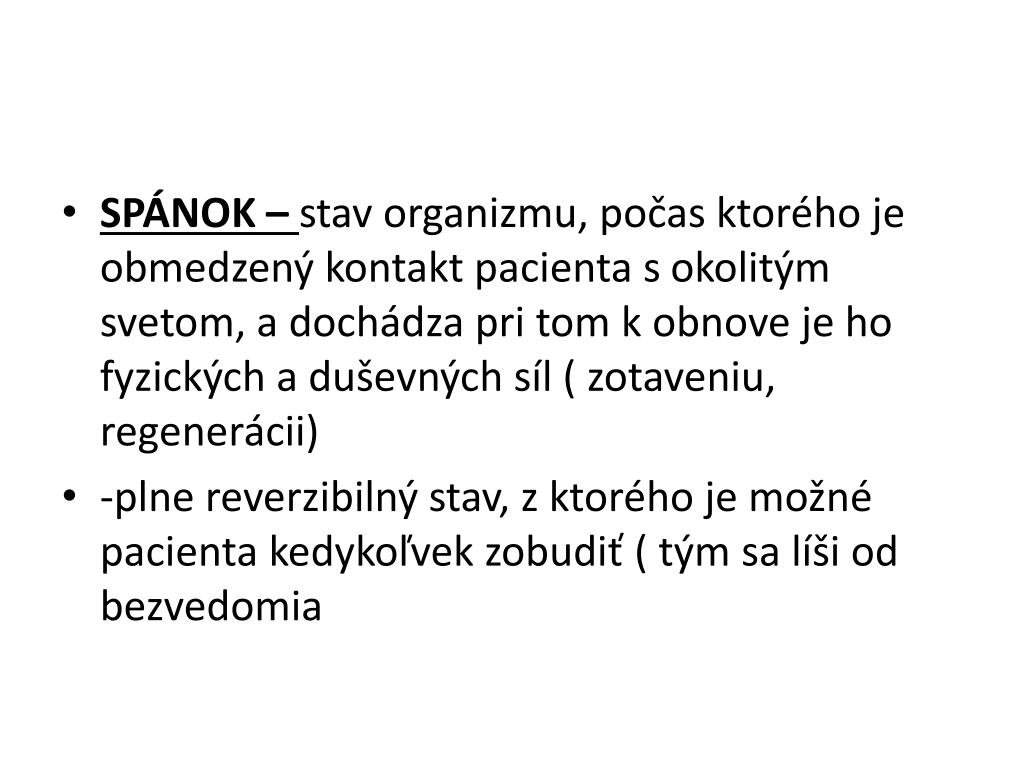 SPÁNOK – stav organizmu, počas ktorého je obmedzený kontakt pacienta s okolitým svetom, a dochádza pri tom k obnove je ho fyzických a duševných síl ( zotaveniu, regenerácii) • -plne reverzibilný stav, z ktorého je možné pacienta kedykoľvek zobudiť ( tým sa líši od bezvedomia