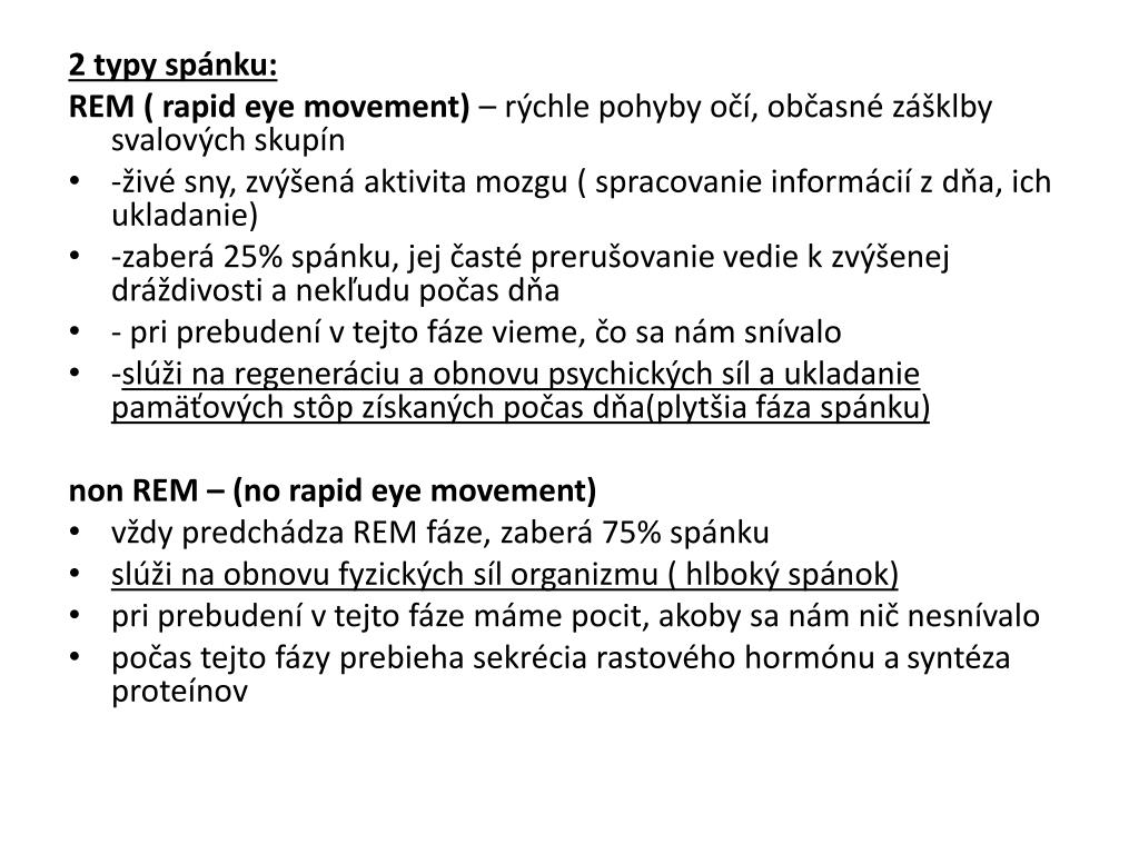 2 typy spánku: REM ( rapideyemovement) – rýchle pohyby očí, občasné zášklby svalových skupín • -živé sny, zvýšená aktivita mozgu ( spracovanie informácií z dňa, ich ukladanie) • -zaberá 25% spánku, jej časté prerušovanie vedie k zvýšenej dráždivosti a nekľudu počas dňa • - pri prebudení v tejto fáze vieme, čo sa nám snívalo • -slúži na regeneráciu a obnovu psychických síl a ukladanie pamäťových stôp získaných počas dňa(plytšia fáza spánku) non REM – (no rapideyemovement) • vždy predchádza REM fáze, zaberá 75% spánku • slúži na obnovu fyzických síl organizmu ( hlboký spánok) • pri prebudení v tejto fáze máme pocit, akoby sa nám nič nesnívalo • počas tejto fázy prebieha sekrécia rastového hormónu a syntéza proteínov