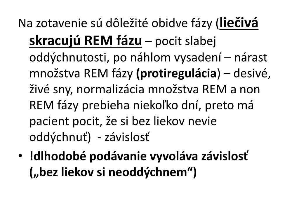 Na zotavenie sú dôležité obidve fázy (liečivá skracujú REM fázu – pocit slabej oddýchnutosti, po náhlom vysadení – nárast množstva REM fázy (protiregulácia) – desivé, živé sny, normalizácia množstva REM a non REM fázy prebieha niekoľko dní, preto má pacient pocit, že si bez liekov nevie oddýchnuť) - závislosť • !dlhodobé podávanie vyvoláva závislosť („bez liekov si neoddýchnem“)
