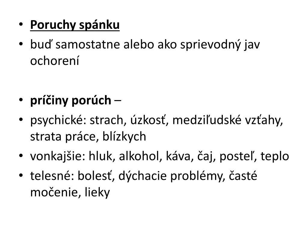 Poruchy spánku • buď samostatne alebo ako sprievodný jav ochorení • príčiny porúch – • psychické: strach, úzkosť, medziľudské vzťahy, strata práce, blízkych • vonkajšie: hluk, alkohol, káva, čaj, posteľ, teplo • telesné: bolesť, dýchacie problémy, časté močenie, lieky