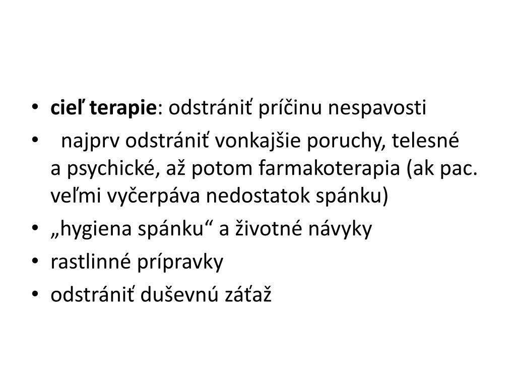 cieľ terapie: odstrániť príčinu nespavosti • najprv odstrániť vonkajšie poruchy, telesné a psychické, až potom farmakoterapia (ak pac. veľmi vyčerpáva nedostatok spánku) • „hygiena spánku“ a životné návyky • rastlinné prípravky • odstrániť duševnú záťaž