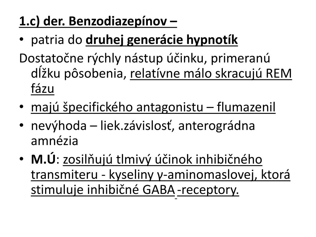 1.c) der. Benzodiazepínov – • patria do druhej generácie hypnotík Dostatočne rýchly nástup účinku, primeranú dĺžku pôsobenia, relatívne málo skracujú REM fázu • majú špecifického antagonistu – flumazenil • nevýhoda – liek.závislosť, anterográdna amnézia • M.Ú: zosilňujú tlmivý účinok inhibičného transmiteru - kyseliny γ-aminomaslovej, ktorá stimuluje inhibičné GABA-receptory.