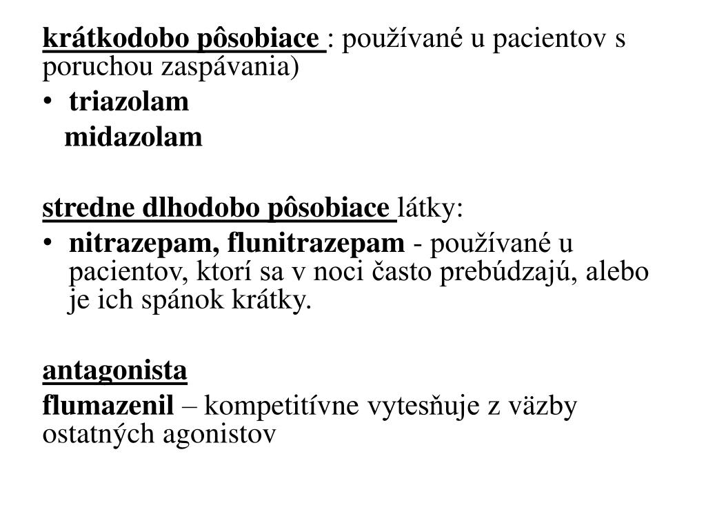 krátkodobo pôsobiace: používané u pacientov s poruchou zaspávania) • triazolam midazolam stredne dlhodobo pôsobiacelátky: • nitrazepam, flunitrazepam - používané u pacientov, ktorí sa v noci často prebúdzajú, alebo je ich spánok krátky. antagonista flumazenil – kompetitívnevytesňuje z väzby ostatných agonistov