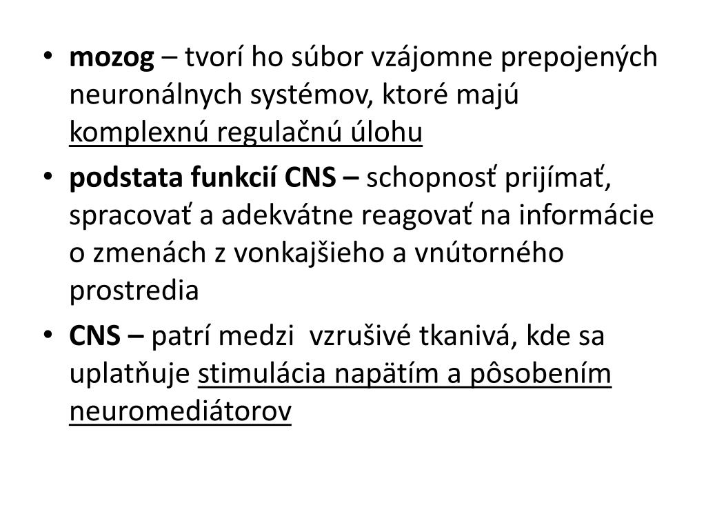 mozog – tvorí ho súbor vzájomne prepojených neuronálnych systémov, ktoré majú komplexnú regulačnú úlohu • podstata funkcií CNS – schopnosť prijímať, spracovať a adekvátne reagovať na informácie o zmenách z vonkajšieho a vnútorného prostredia • CNS – patrí medzi vzrušivé tkanivá, kde sa uplatňuje stimulácia napätím a pôsobením neuromediátorov