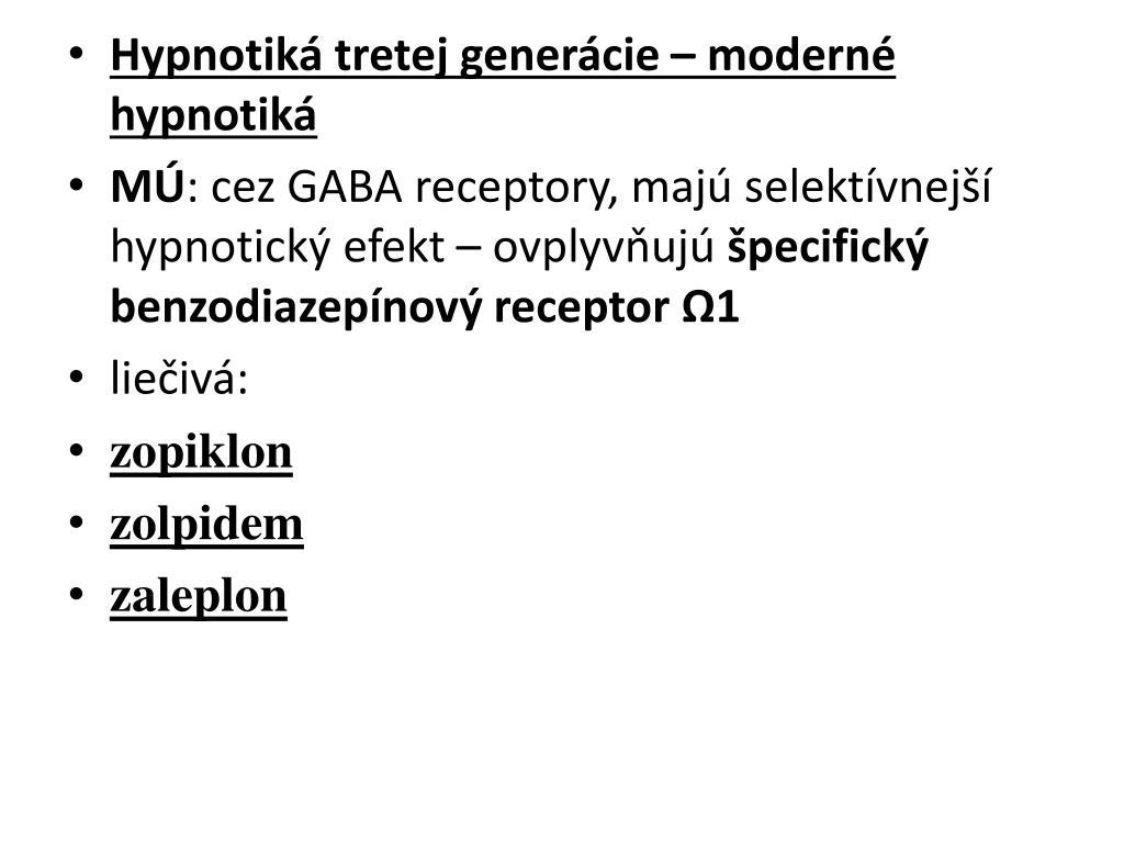 Hypnotiká tretej generácie – moderné hypnotiká • MÚ: cez GABA receptory, majú selektívnejší hypnotický efekt – ovplyvňujú špecifický benzodiazepínový receptor Ω1 • liečivá: • zopiklon • zolpidem • zaleplon