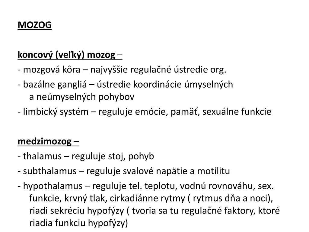 MOZOG koncový (veľký) mozog – - mozgová kôra – najvyššie regulačné ústredie org. - bazálne gangliá – ústredie koordinácie úmyselných a neúmyselných pohybov - limbický systém – reguluje emócie, pamäť, sexuálne funkcie medzimozog – - thalamus – reguluje stoj, pohyb - subthalamus – reguluje svalové napätie a motilitu - hypothalamus – reguluje tel. teplotu, vodnú rovnováhu, sex. funkcie, krvný tlak, cirkadiánne rytmy ( rytmus dňa a noci), riadi sekréciu hypofýzy ( tvoria sa tu regulačné faktory, ktoré riadia funkciu hypofýzy)