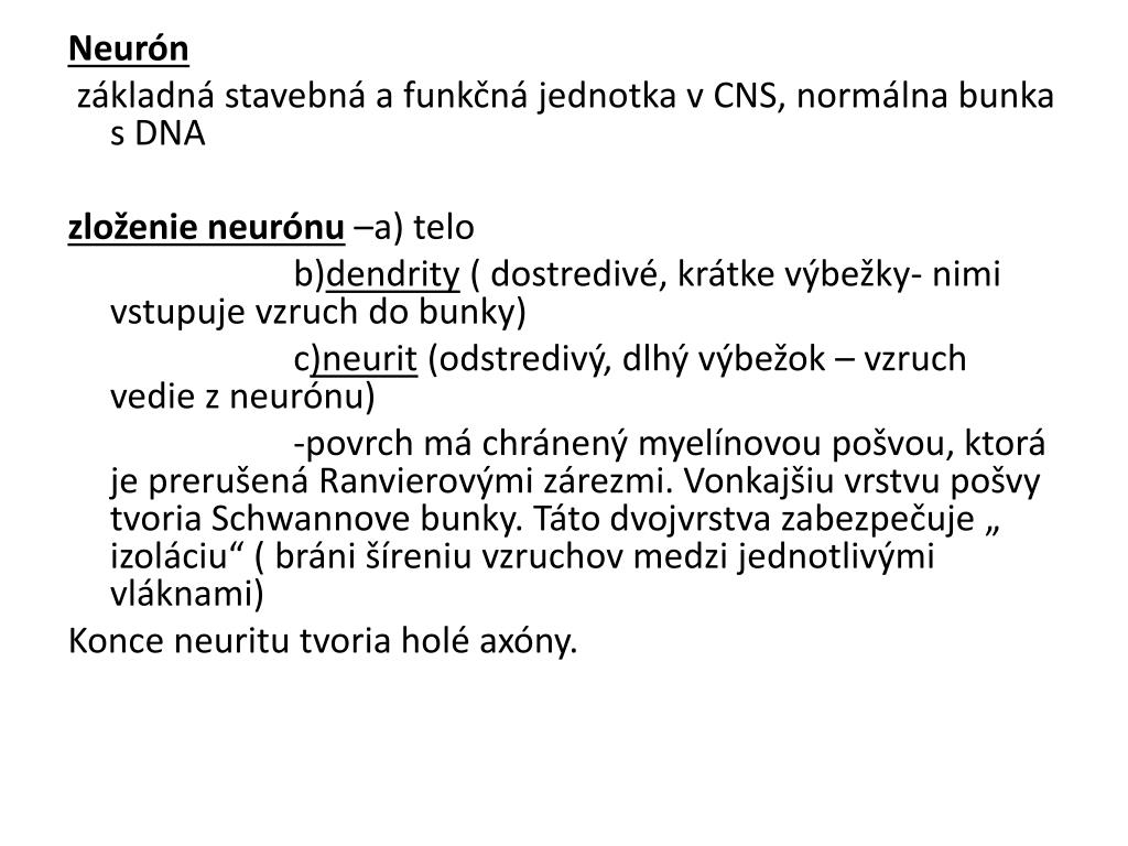 Neurón základná stavebná a funkčná jednotka v CNS, normálna bunka s DNA zloženie neurónu –a) telo b)dendrity ( dostredivé, krátke výbežky- nimi vstupuje vzruch do bunky) c)neurit (odstredivý, dlhý výbežok – vzruch vedie z neurónu) -povrch má chránený myelínovou pošvou, ktorá je prerušená Ranvierovými zárezmi. Vonkajšiu vrstvu pošvy tvoria Schwannove bunky. Táto dvojvrstva zabezpečuje „ izoláciu“ ( bráni šíreniu vzruchov medzi jednotlivými vláknami) Konce neuritu tvoria holé axóny.