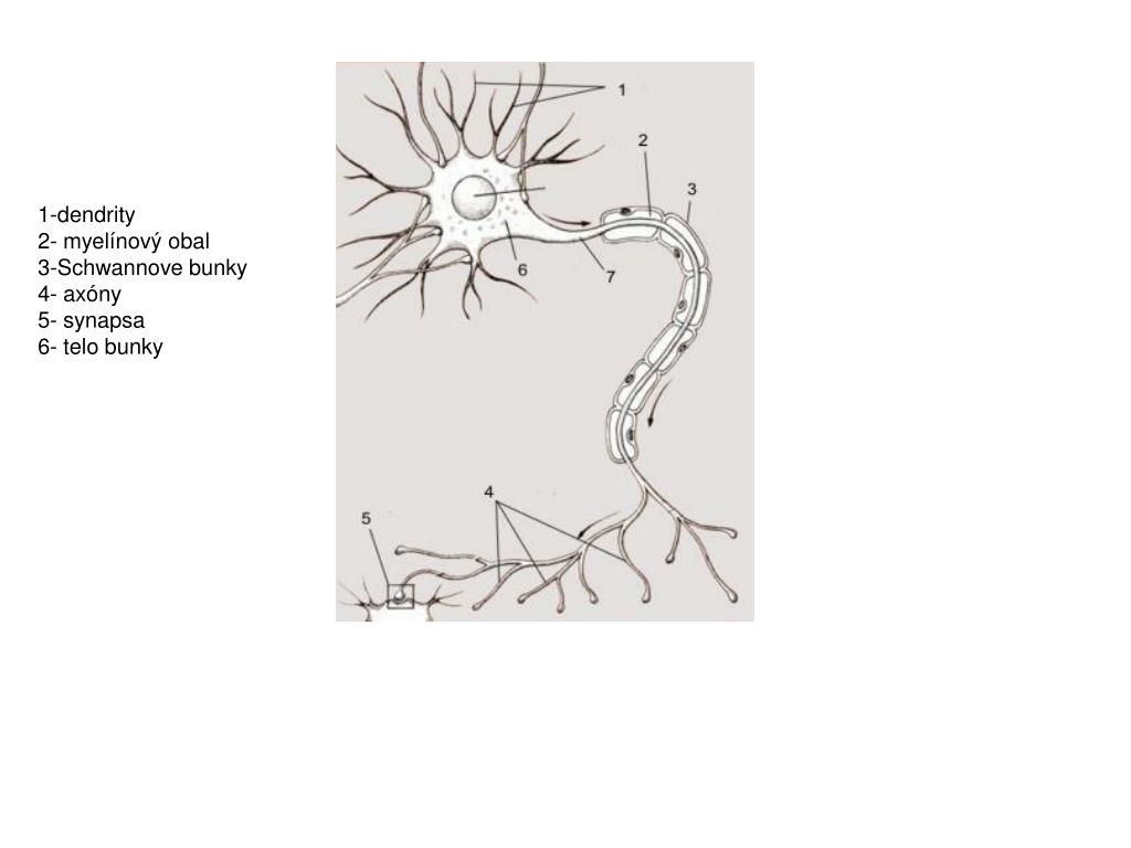 1-dendrity 2- myelínový obal 3-Schwannove bunky 4- axóny 5- synapsa 6- telo bunky