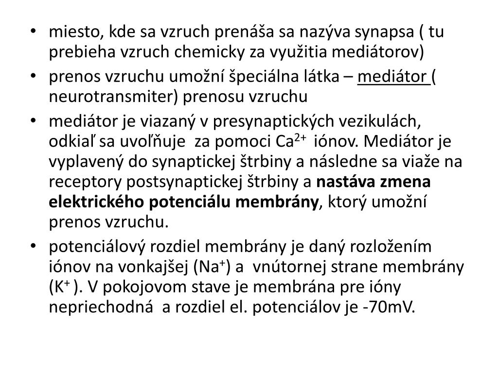 miesto, kde sa vzruch prenáša sa nazýva synapsa ( tu prebieha vzruch chemicky za využitia mediátorov) • prenos vzruchu umožní špeciálna látka – mediátor( neurotransmiter) prenosu vzruchu • mediátor je viazaný v presynaptickýchvezikulách, odkiaľ sa uvoľňuje za pomoci Ca2+ iónov. Mediátor je vyplavený do synaptickej štrbiny a následne sa viaže na receptory postsynaptickej štrbiny a nastáva zmena elektrického potenciálu membrány, ktorý umožní prenos vzruchu. • potenciálový rozdiel membrány je daný rozložením iónov na vonkajšej (Na+) a vnútornej strane membrány (K+ ). V pokojovom stave je membrána pre ióny nepriechodná a rozdiel el. potenciálov je -70mV.