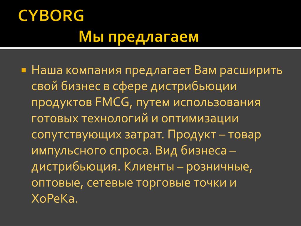 CYBORG Мы предлагаем • Наша компания предлагает Вам расширить свой бизнес в сфере дистрибьюции продуктов FMCG, путем использования готовых технологий и оптимизации сопутствующих затрат. Продукт – товар импульсного спроса. Вид бизнеса – дистрибьюция. Клиенты – розничные, оптовые, сетевые торговые точки и ХоРеКа.