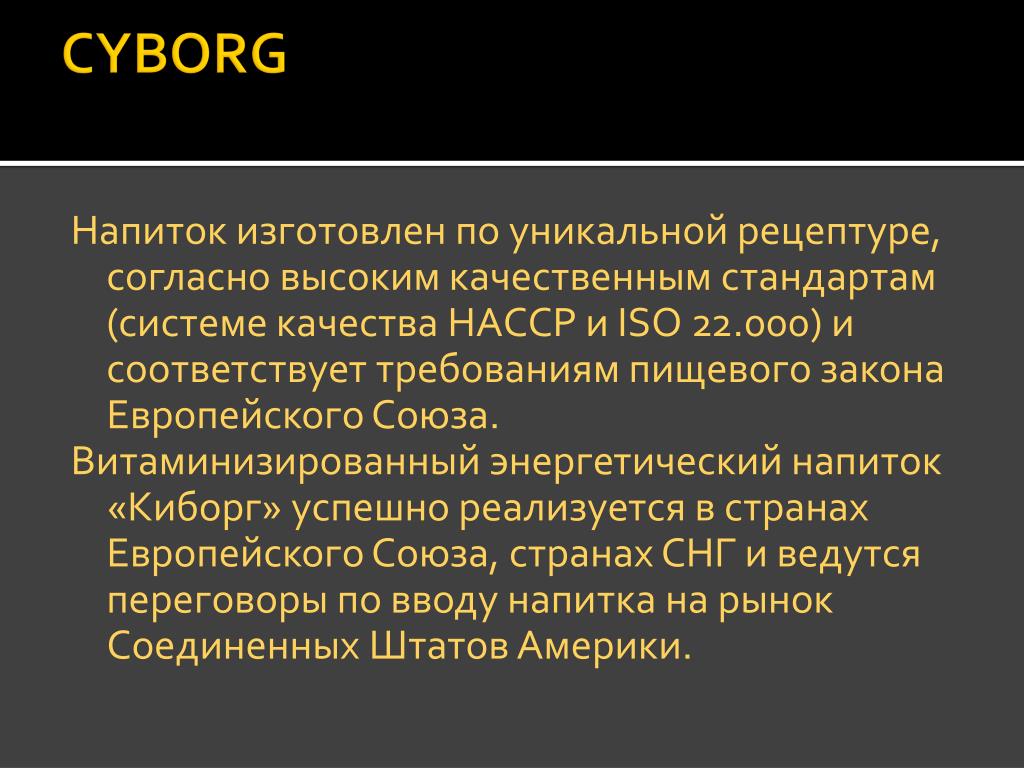 CYBORG Напиток изготовлен по уникальной рецептуре, согласно высоким качественным стандартам (системе качества НАССР и ISO 22.000) и соответствует требованиям пищевого закона Европейского Союза. Витаминизированный энергетический напиток «Киборг» успешно реализуется в странах Европейского Союза, странах СНГ и ведутся переговоры по вводу напитка на рынок Соединенных Штатов Америки.
