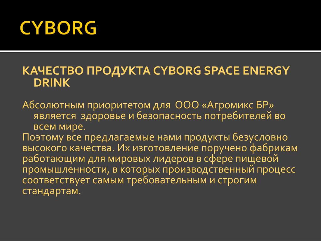 CYBORG КАЧЕСТВО ПРОДУКТАCYBORG SPACE ENERGY DRINK Абсолютным приоритетом для ООО «Агромикс БР» является здоровье и безопасность потребителей во всем мире. Поэтому все предлагаемые нами продукты безусловно высокого качества. Их изготовление поручено фабрикам работающим для мировых лидеров в сфере пищевой промышленности, в которых производственный процесс соответствует самым требовательным и строгим стандартам.