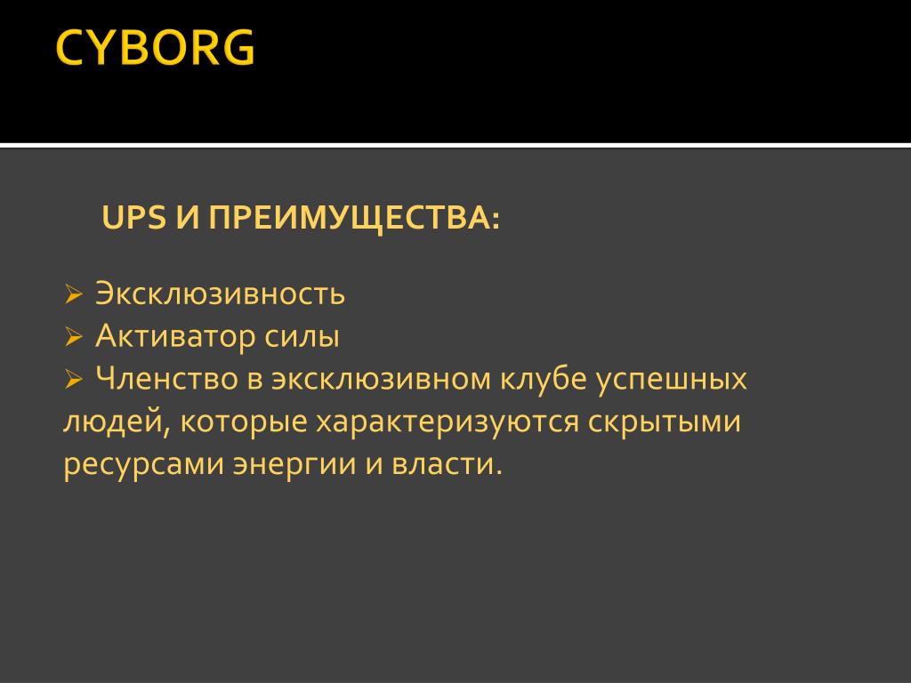 CYBORG UPS И ПРЕИМУЩЕСТВА: • Эксклюзивность • Aктиватор силы • Членство в эксклюзивном клубе успешных людей, которые характеризуются скрытыми ресурсами энергии и власти.