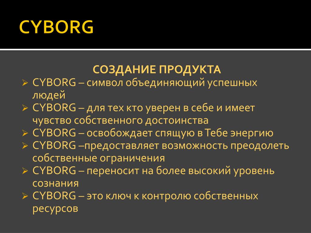 CYBORG СОЗДАНИЕ ПРОДУКТА • CYBORG – символ объединяющий успешных людей • CYBORG – для тех кто уверен в себе и имеет чувство собственного достоинства • CYBORG – освобождает спящую в Тебе энергию • CYBORG –предоставляет возможность преодолеть собственные ограничения • CYBORG – переносит на более высокий уровень сознания • CYBORG – это ключ к контролю собственных ресурсов