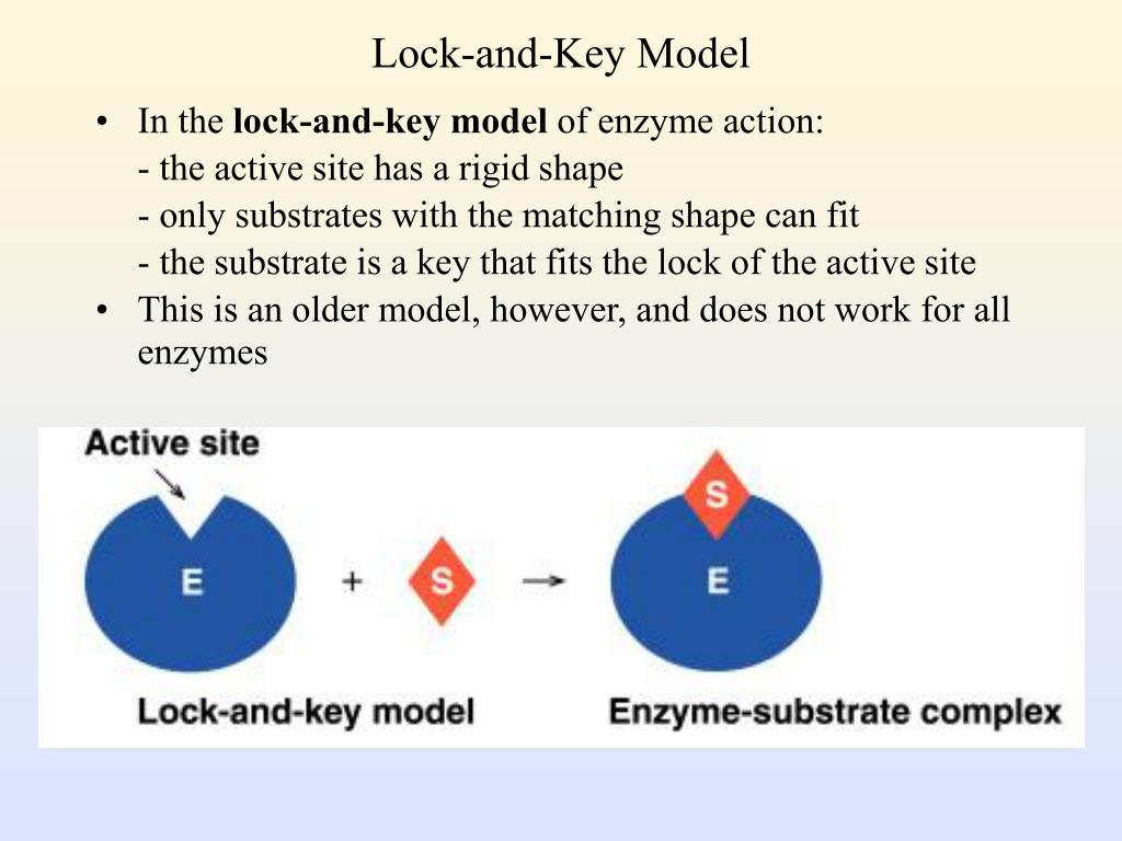 Lock-and-Key Model • In the lock-and-key model of enzyme action: - the active site has a rigid shape - only substrates with the matching shape can fit - the substrate is a key that fits the lock of the active site • This is an older model, however, and does not work for all enzymes
