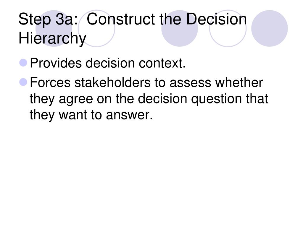 Step 3a: Construct the Decision Hierarchy Provides decision context. Forces stakeholders to assess whether they agree on the decision question that they want to answer.