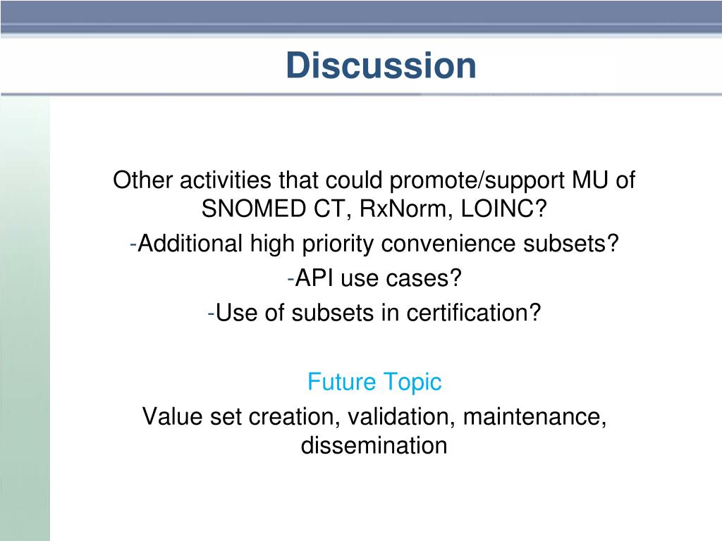 Discussion Other activities that could promote/support MU of SNOMED CT, RxNorm, LOINC? • Additional high priority convenience subsets? • API use cases? • Use of subsets in certification? Future Topic Value set creation, validation, maintenance, dissemination