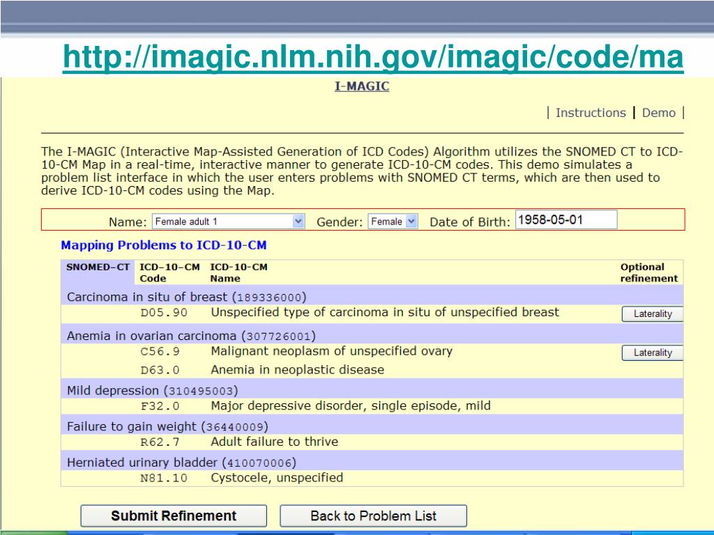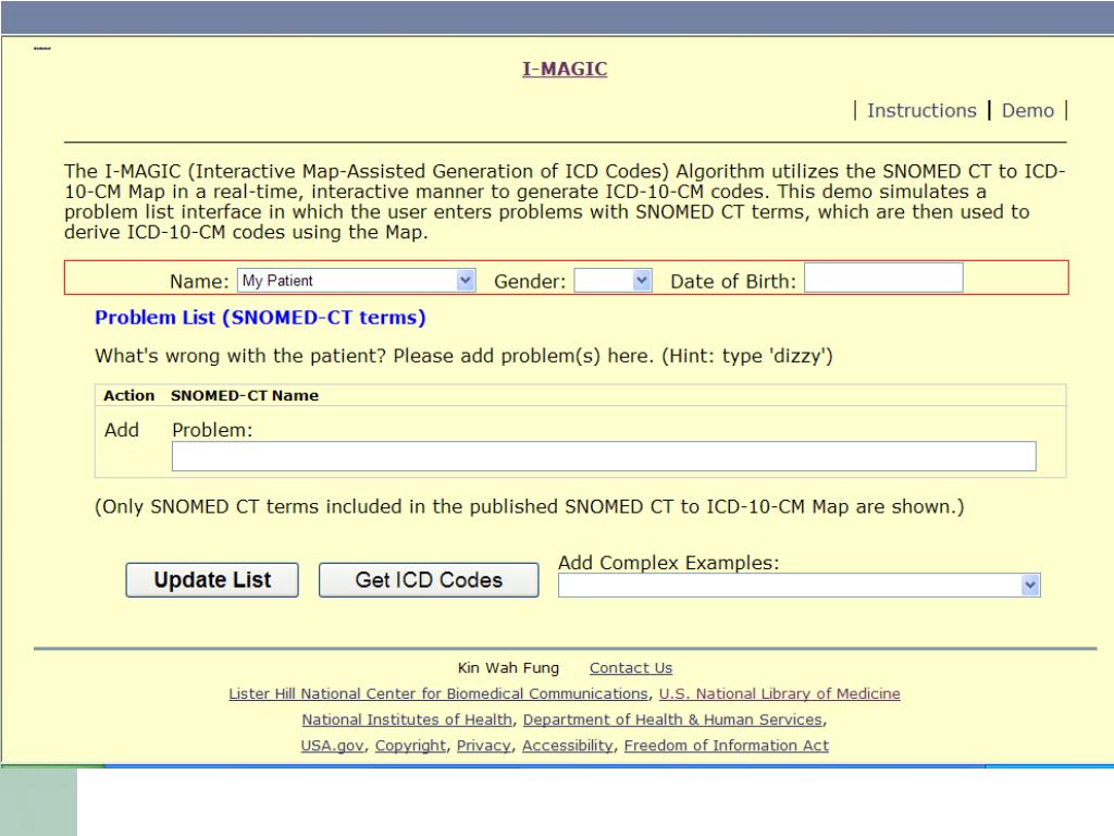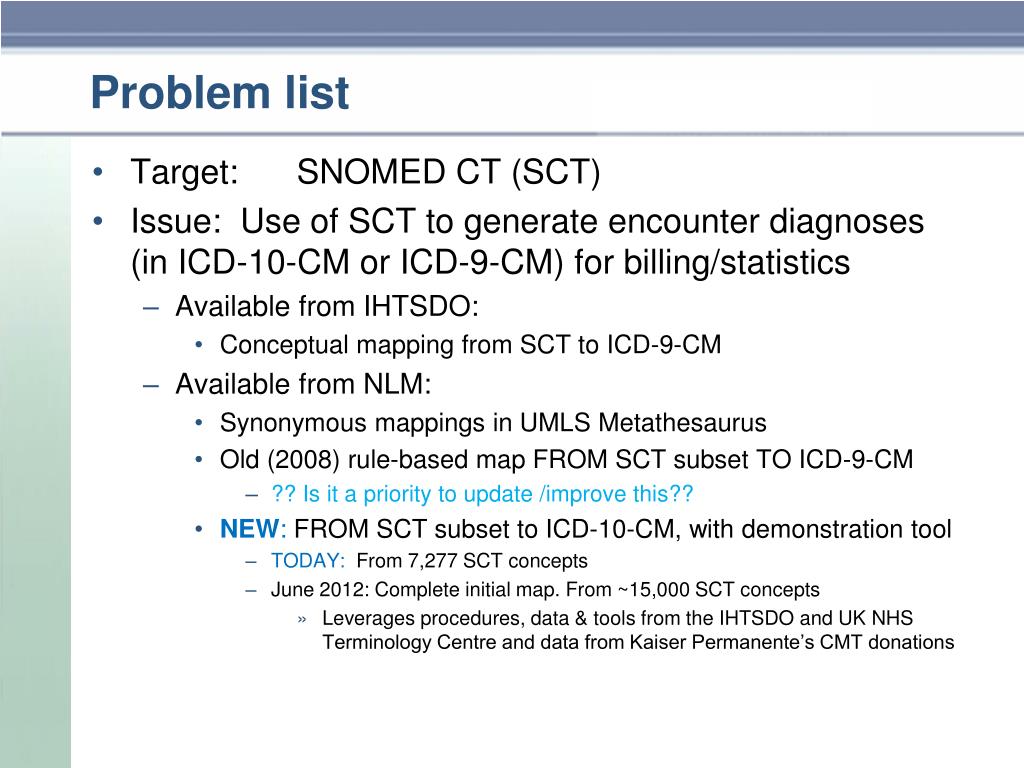 Problem list • Target: SNOMED CT (SCT) • Issue: Use of SCT to generate encounter diagnoses (in ICD-10-CM or ICD-9-CM) for billing/statistics • Available from IHTSDO: • Conceptual mapping from SCT to ICD-9-CM • Available from NLM: • Synonymous mappings in UMLS Metathesaurus • Old (2008) rule-based map FROM SCT subset TO ICD-9-CM • ?? Is it a priority to update /improve this?? • NEW: FROM SCT subset to ICD-10-CM, with demonstration tool • TODAY: From 7,277 SCT concepts • June 2012: Complete initial map. From ~15,000 SCT concepts • Leverages procedures, data & tools from the IHTSDO and UK NHS Terminology Centre and data from Kaiser Permanente’s CMT donations