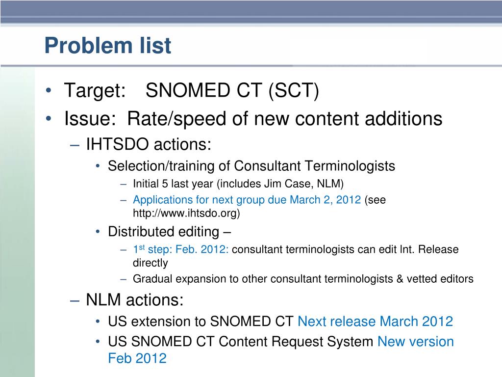 Problem list • Target: SNOMED CT (SCT) • Issue: Rate/speed of new content additions • IHTSDO actions: • Selection/training of Consultant Terminologists • Initial 5 last year (includes Jim Case, NLM) • Applications for next group due March 2, 2012 (see http://www.ihtsdo.org) • Distributed editing – • 1st step: Feb. 2012: consultant terminologists can edit lnt. Release directly • Gradual expansion to other consultant terminologists & vetted editors • NLM actions: • US extension to SNOMED CT Next release March 2012 • US SNOMED CT Content Request System New version Feb 2012