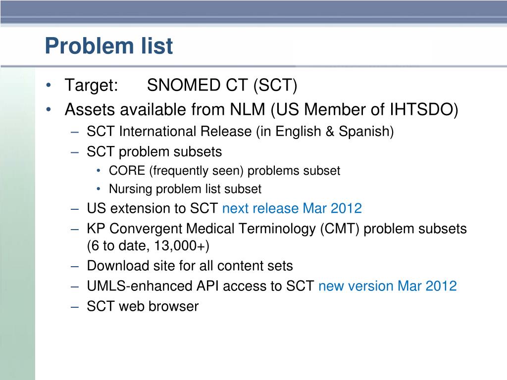 Problem list • Target: SNOMED CT (SCT) • Assets available from NLM (US Member of IHTSDO) • SCT International Release (in English & Spanish) • SCT problem subsets • CORE (frequently seen) problems subset • Nursing problem list subset • US extension to SCT next release Mar 2012 • KP Convergent Medical Terminology (CMT) problem subsets (6 to date, 13,000+) • Download site for all content sets • UMLS-enhanced API access to SCT new version Mar 2012 • SCT web browser