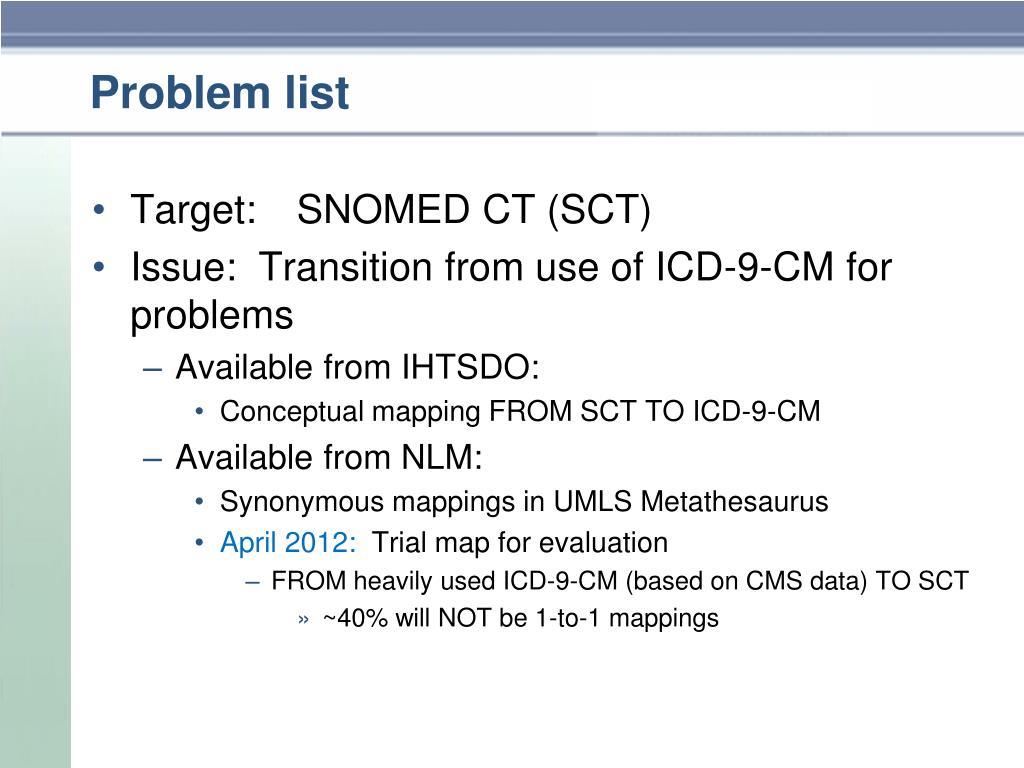 Problem list • Target: SNOMED CT (SCT) • Issue: Transition from use of ICD-9-CM for problems • Available from IHTSDO: • Conceptual mapping FROM SCT TO ICD-9-CM • Available from NLM: • Synonymous mappings in UMLS Metathesaurus • April 2012: Trial map for evaluation • FROM heavily used ICD-9-CM (based on CMS data) TO SCT • ~40% will NOT be 1-to-1 mappings
