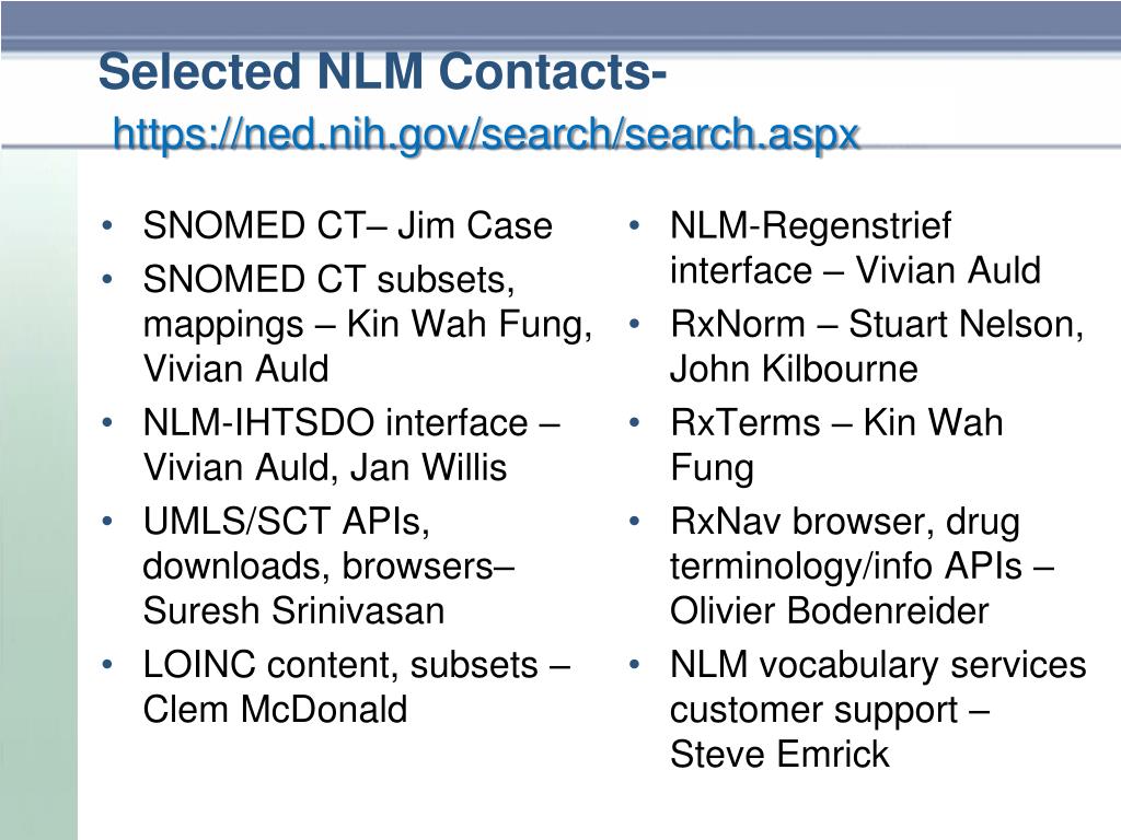 Selected NLM Contacts- https://ned.nih.gov/search/search.aspx • SNOMED CT– Jim Case • SNOMED CT subsets, mappings – Kin Wah Fung, Vivian Auld • NLM-IHTSDO interface – Vivian Auld, Jan Willis • UMLS/SCT APIs, downloads, browsers– Suresh Srinivasan • LOINC content, subsets – Clem McDonald NLM-Regenstrief interface – Vivian Auld RxNorm – Stuart Nelson, John Kilbourne RxTerms – Kin Wah Fung RxNav browser, drug terminology/info APIs – Olivier Bodenreider NLM vocabulary services customer support – Steve Emrick