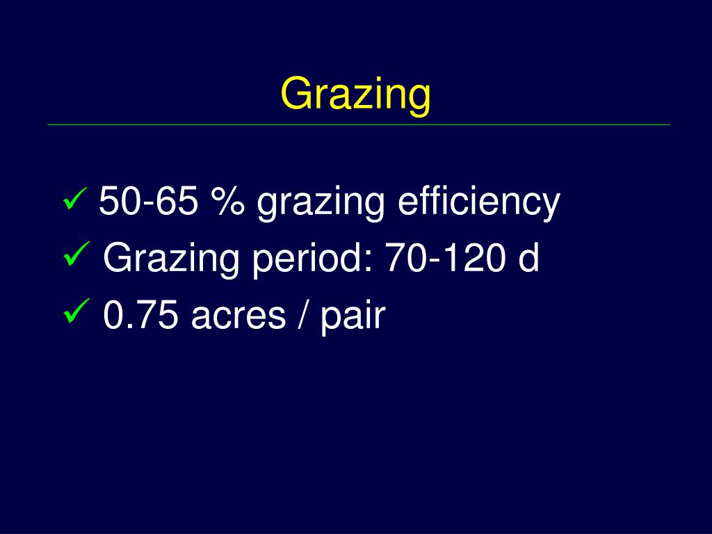 Grazing • 50-65 % grazing efficiency • Grazing period: 70-120 d • 0.75 acres / pair