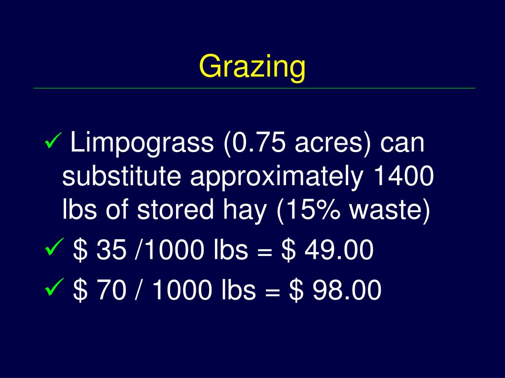 Grazing • Limpograss (0.75 acres) can substitute approximately 1400 lbs of stored hay (15% waste) • $ 35 /1000 lbs = $ 49.00 • $ 70 / 1000 lbs = $ 98.00