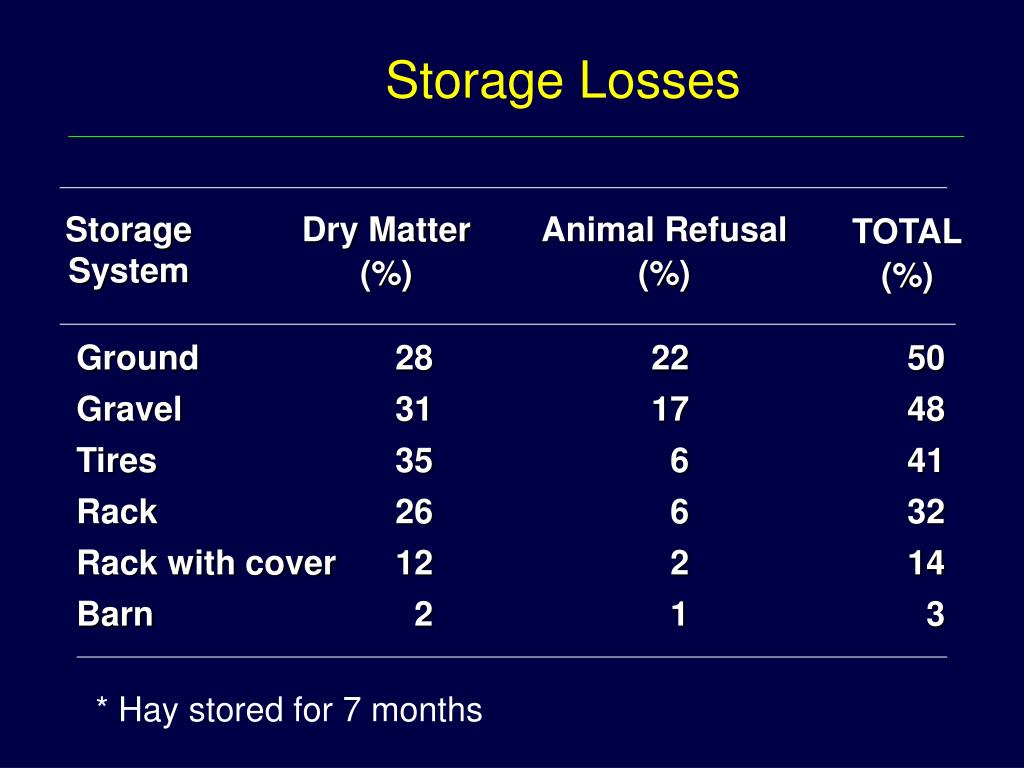 Storage Losses StorageSystem Dry Matter (%) Animal Refusal (%) TOTAL (%) Ground 28 22 50 Gravel 31 17 48 Tires 35 6 41 Rack 26 6 32 Rack with cover 12 2 14 Barn 2 1 3 * Hay stored for 7 months