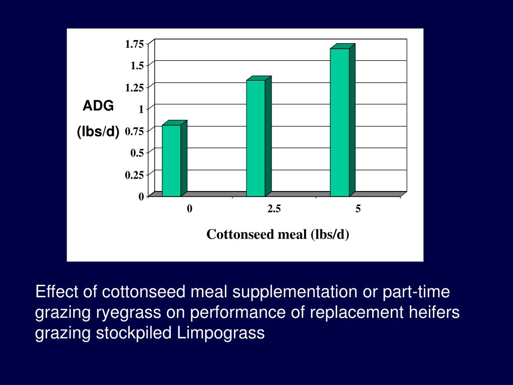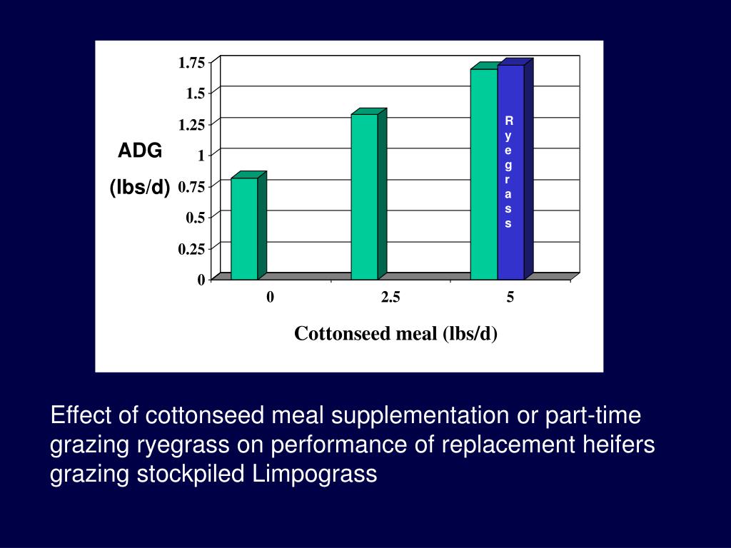 Ryegrass ADG (lbs/d) Cottonseed meal (lbs/d) Effect of cottonseed meal supplementation or part-time grazing ryegrass on performance of replacement heifers grazing stockpiled Limpograss