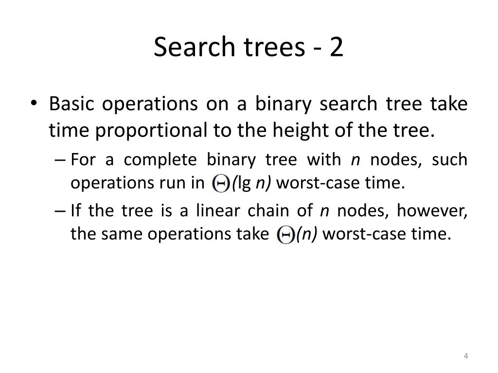 Search trees - 2 • Basic operations on a binary search tree take time proportional to the height of the tree. • For a complete binary tree with n nodes, such operations run in (lgn) worst-case time. • If the tree is a linear chain of n nodes, however, the same operations take (n) worst-case time.
