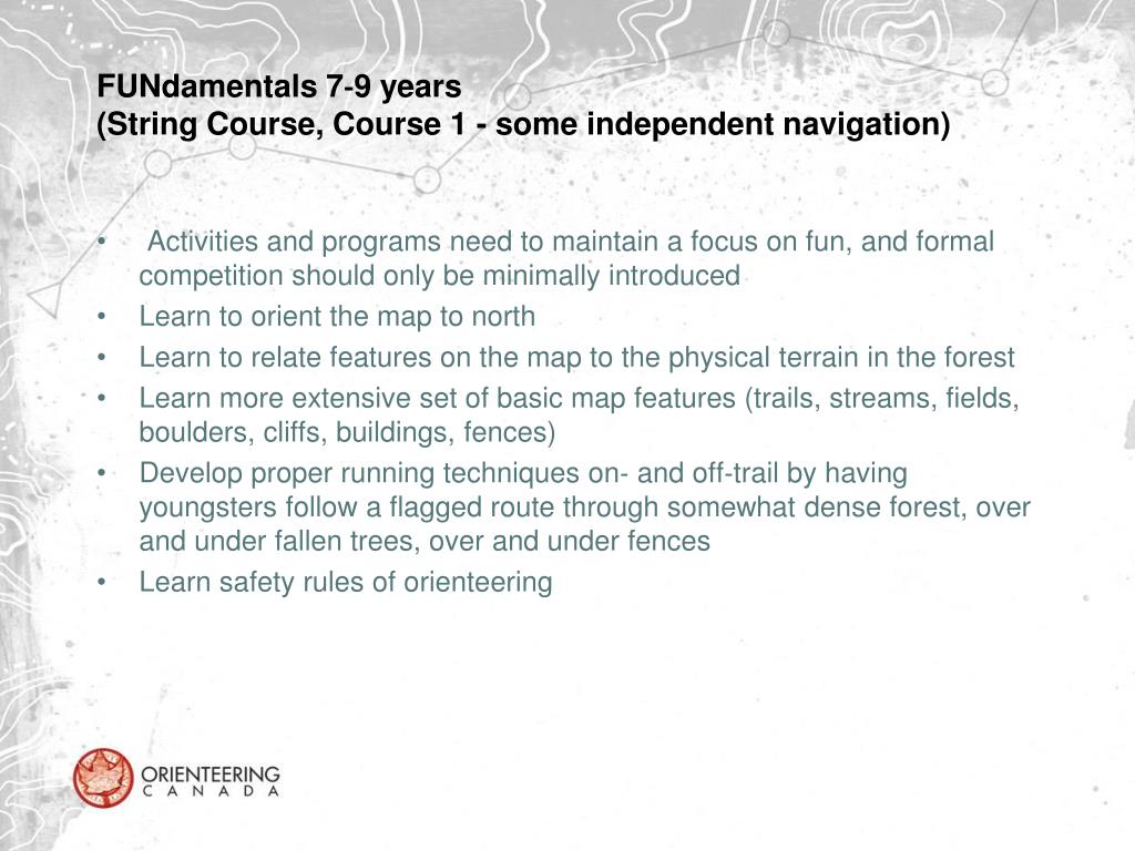 FUNdamentals 7‐9 years (String Course, Course 1 - some independent navigation) • Activities and programs need to maintain a focus on fun, and formal competition should only be minimally introduced • Learn to orient the map to north • Learn to relate features on the map to the physical terrain in the forest • Learn more extensive set of basic map features (trails, streams, fields, boulders, cliffs, buildings, fences) • Develop proper running techniques on‐ and off‐trail by having youngsters follow a flagged route through somewhat dense forest, over and under fallen trees, over and under fences • Learn safety rules of orienteering